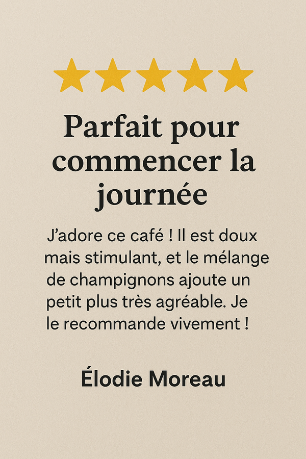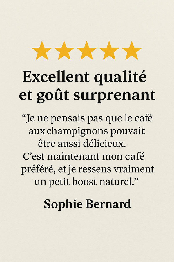 Louise T.Une révelation"J’étais curieux de tester ce café aux champignons, et je ne suis pas déçu. C’est vraiment agréable. Le goût est super équilibré idéal pour un matin tranquille ou une pause au bureau."