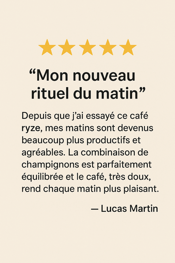 Samuel M.Un vrai café"Le café Ryze aux champignons, c’est une expérience à part. Moins d’acidité, plus de douceur, et je me sens bien toute la matinée. Un vrai boost d’énergie, sans les montagnes russes habituelles !"